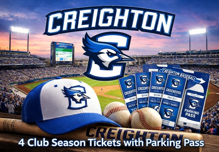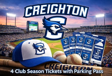 Enjoy the ultimate game-day experience with (4) Creighton Baseball Club Season Tickets in Section 216, Row 7, Seats 1–4, plus a parking pass included.