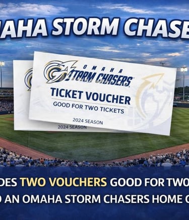 Enjoy a night at the ballpark with two ticket vouchers to an Omaha Storm Chasers regular season home game. A great outing for date night, friends, or family fun at Werner Park.